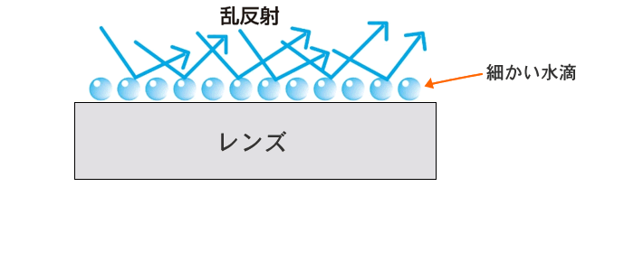 温度差によってレンズ表面に空気中の水分が結露して細かな水滴が発生しその水滴で光が乱反射することにより透明度が低下して曇りを生じます。