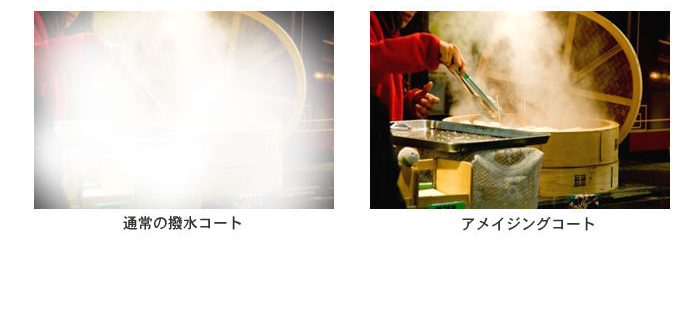 レンズ表面に親水性の高い防曇膜コートを施すことで、水滴を作らず乱反射を抑え、レンズの曇りを抑えています。